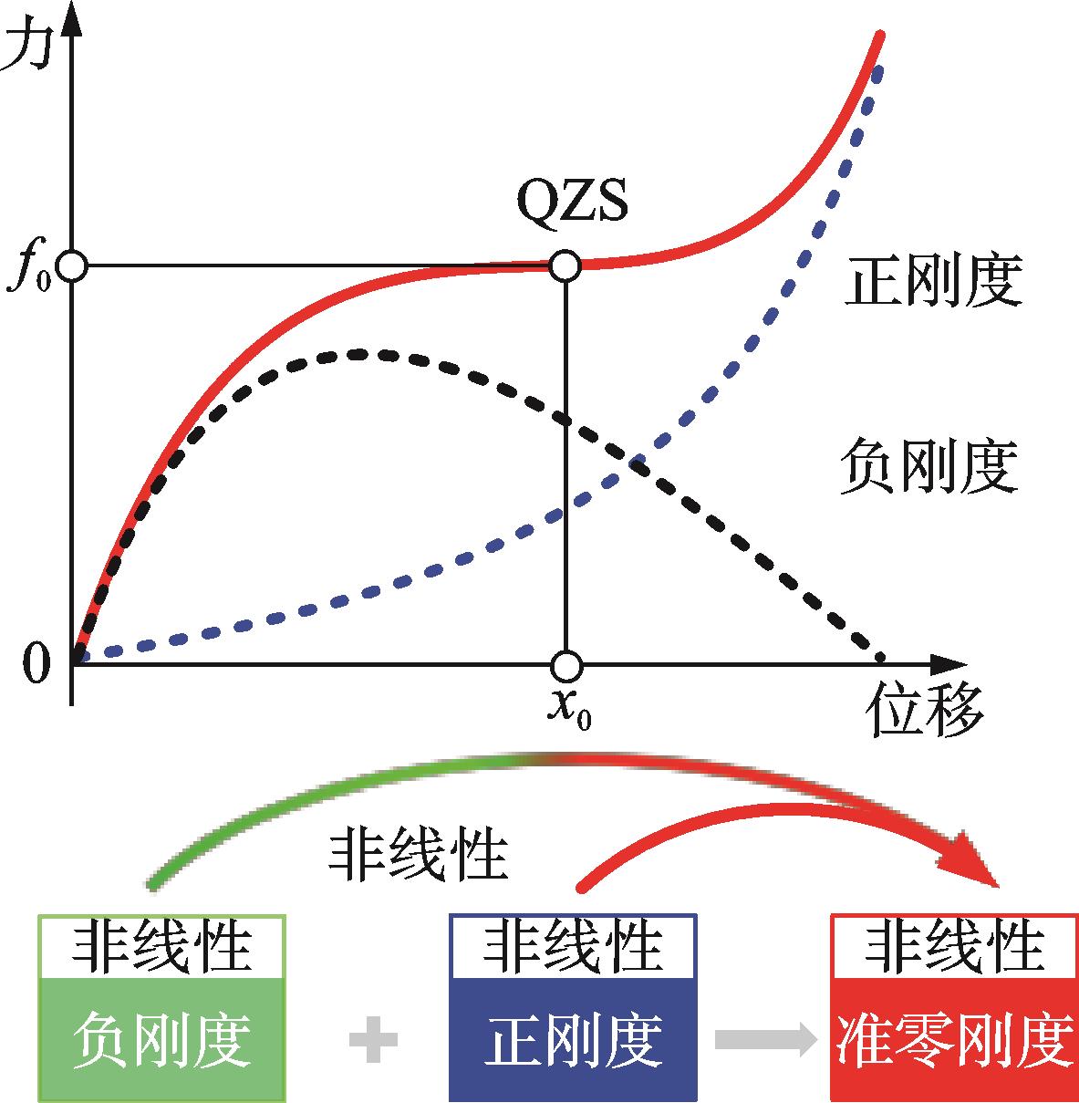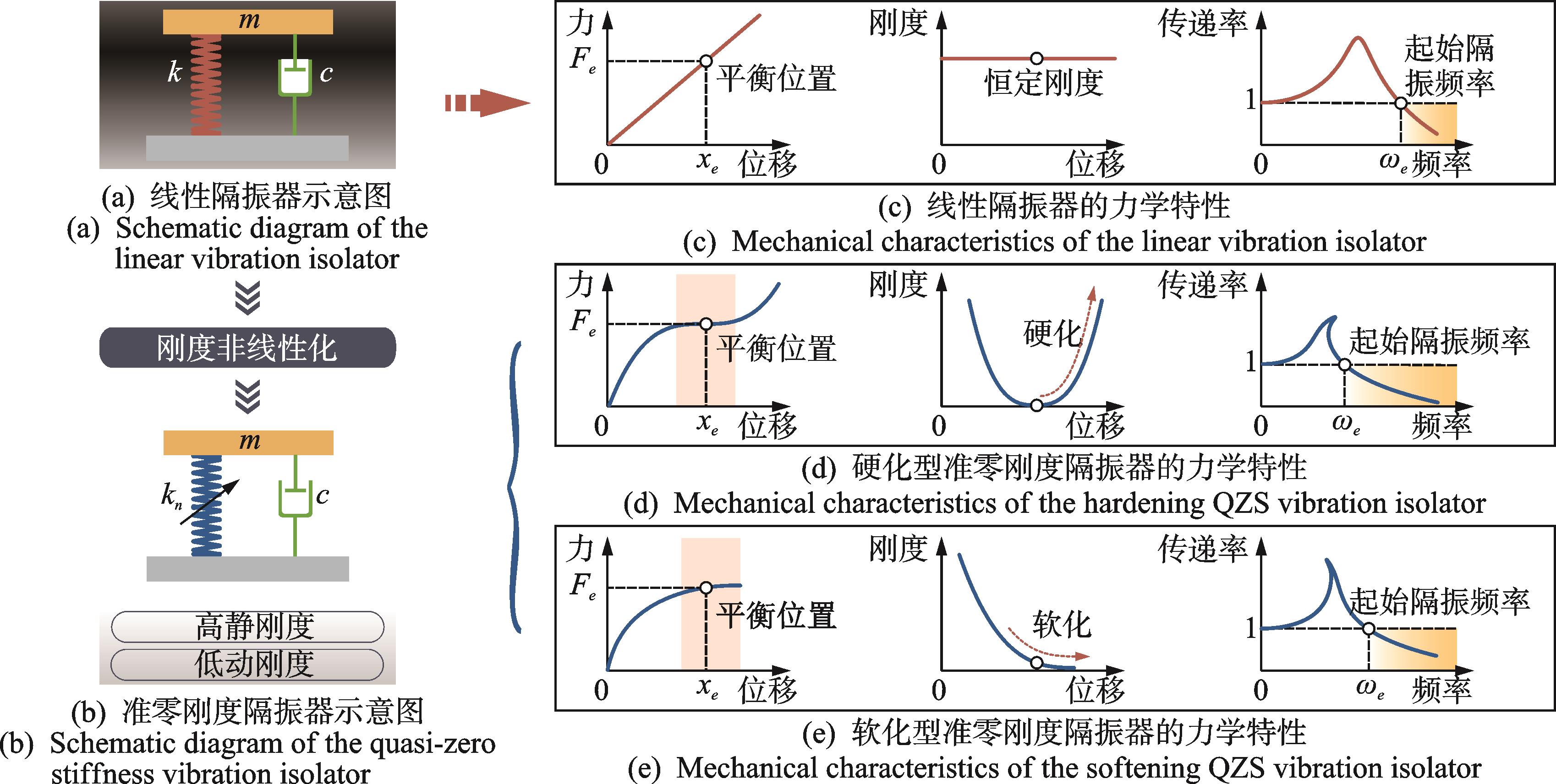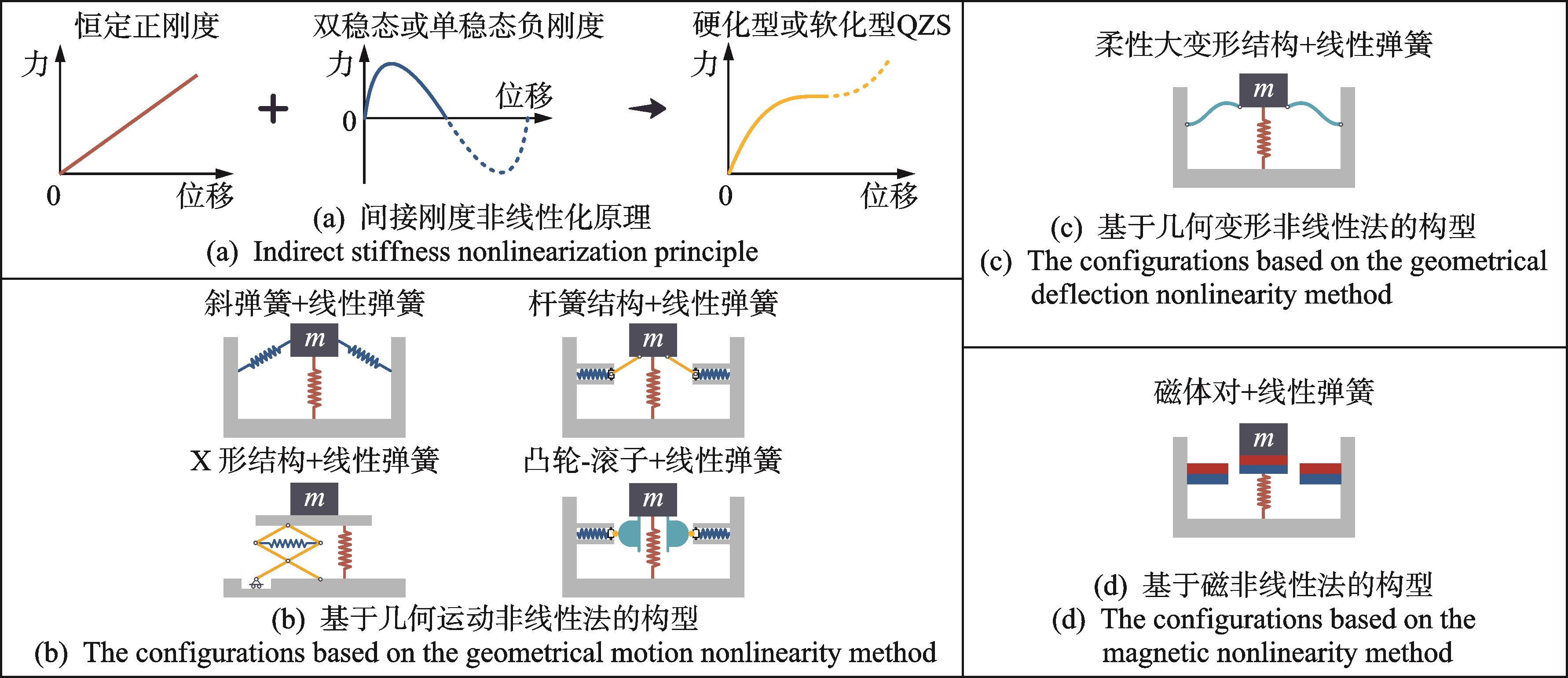 摘要:准零刚度(quasi-zero stiffness,简称QZS)隔振通过引入刚度非线性,有效解决了传统线性隔振在承载能力与隔振带宽之间的固有矛盾,展现出优异的低频隔振性能。如何设计力学结构,使隔振器力-位移曲线同时具备高静刚度与低动刚度特征,是实现准零刚度隔振的核心问题。围绕准零刚度隔振设计方法,首先,阐述了准零刚度隔振的基本原理,并根据刚度非线性化的实现途径,将传统设计方法归纳为几何运动非线性法、几何变形非线性法、磁非线性法以及应力-应变非线性法;其次,介绍了基于非线性正刚度结构的新兴准零刚度设计方法,包括渐硬型与渐软型非线性正刚度结构,并与传统方法进行了对比分析,讨论了二者在静力学与动力学行为上的差异;最后,从负刚度结构设计、准零刚度特性调控以及应用场景等方面进行了总结与展望,全面梳理了准零刚度隔振设计方法的最新研究进展,为未来的发展方向提供参考。
