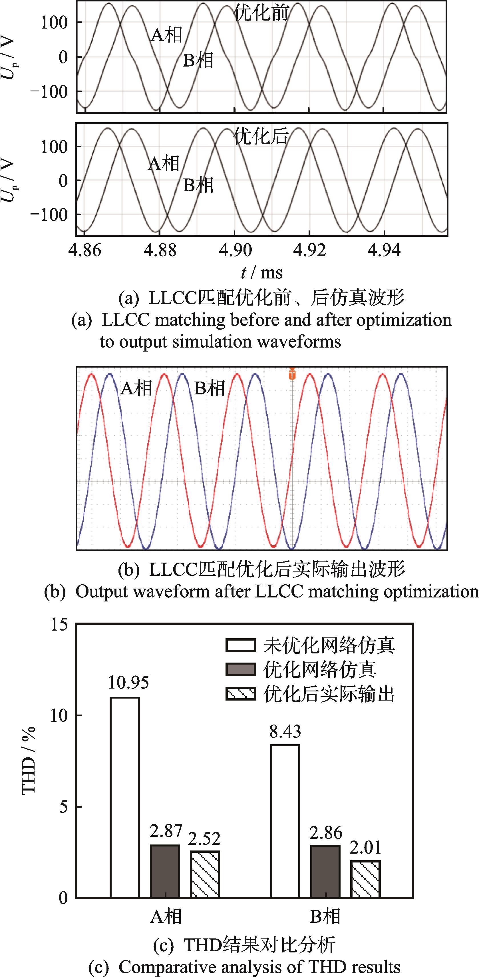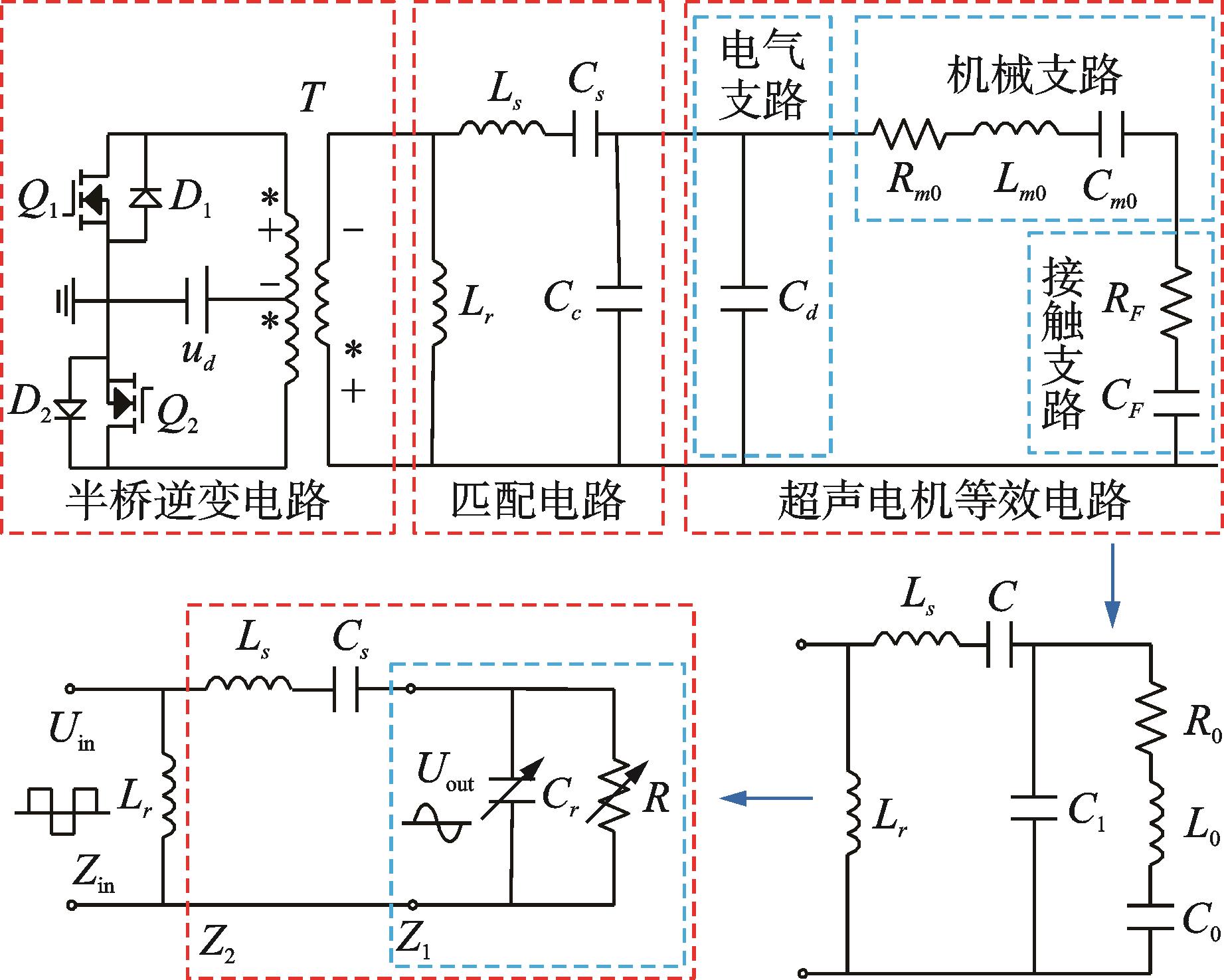 摘要:针对直线超声电机参数时变性以及驱动电压谐波影响其运行稳定性的问题,通过设计两电感-两电容(简称LLCC)谐振网络拓扑及优化其输出电压总谐波畸变率(total harmonic distortion, 简称THD)的方法,提升了电机运行稳定性。首先,采用考虑定/动子接触状态下的等效电路模型,推导出LLCC阻抗匹配的计算公式,引入补偿电容改善阻抗匹配的弹性裕度与稳定性;其次,探讨了谐振点附近的LLCC匹配电路滤波特性,推导出输出电压THD与LLCC谐振电路参数的数学关系,分析了变压器寄生参数对LLCC谐振电路的影响,并提出以正弦输出电压THD 值为主要指标的LLCC 谐振电路优化设计方法;最后,设计了V型直线超声电机的LLCC谐振驱动器。实验结果表明:谐振网络中串、并联电容的比值决定输出电压幅值增益水平、THD和串联电容两端电压峰值,且前两者相互制衡;并联电感值为软开关特性的主要决定因素;驱动电压THD值控制在3%以内,相比优化前提升了70%以上。