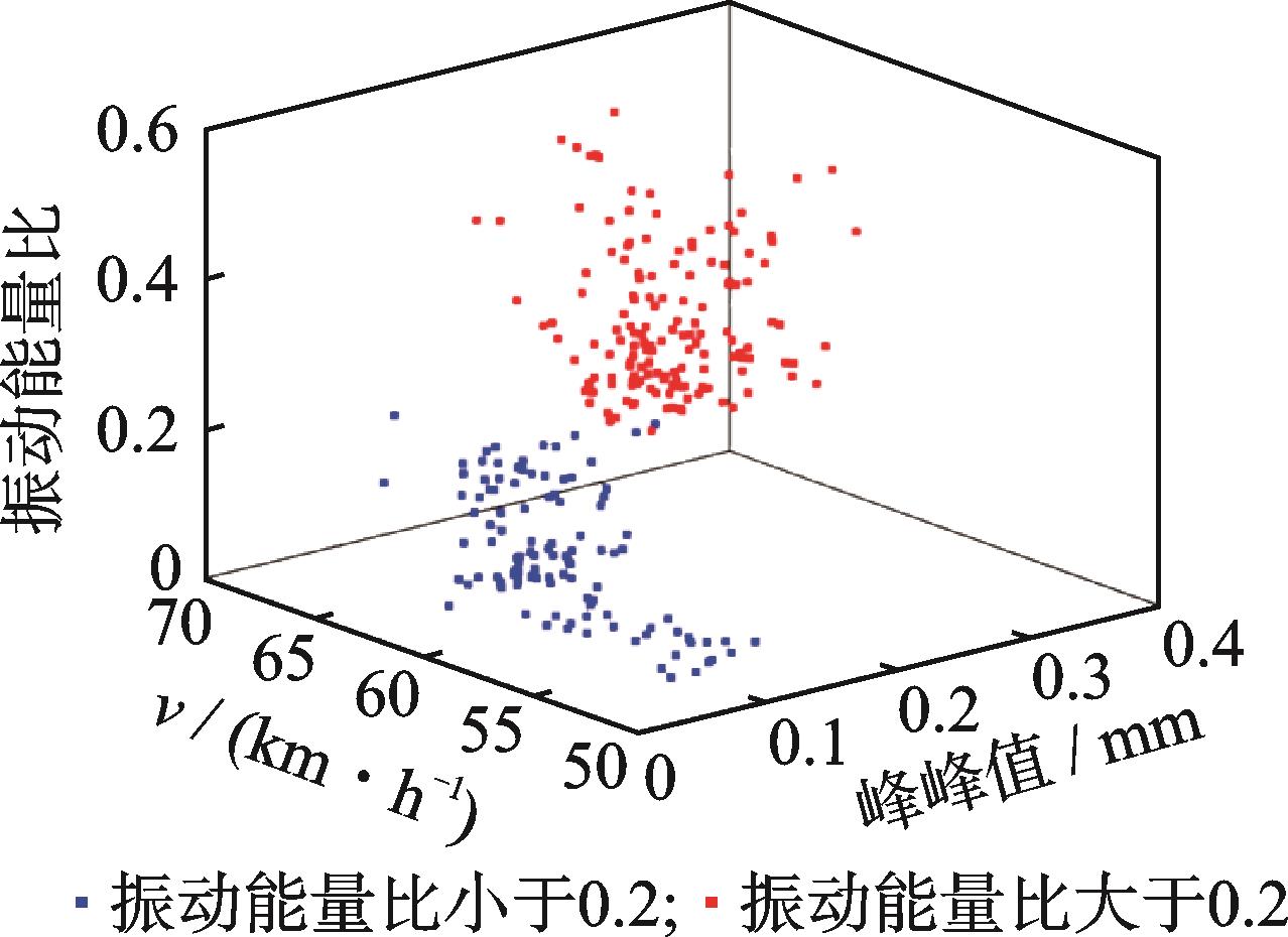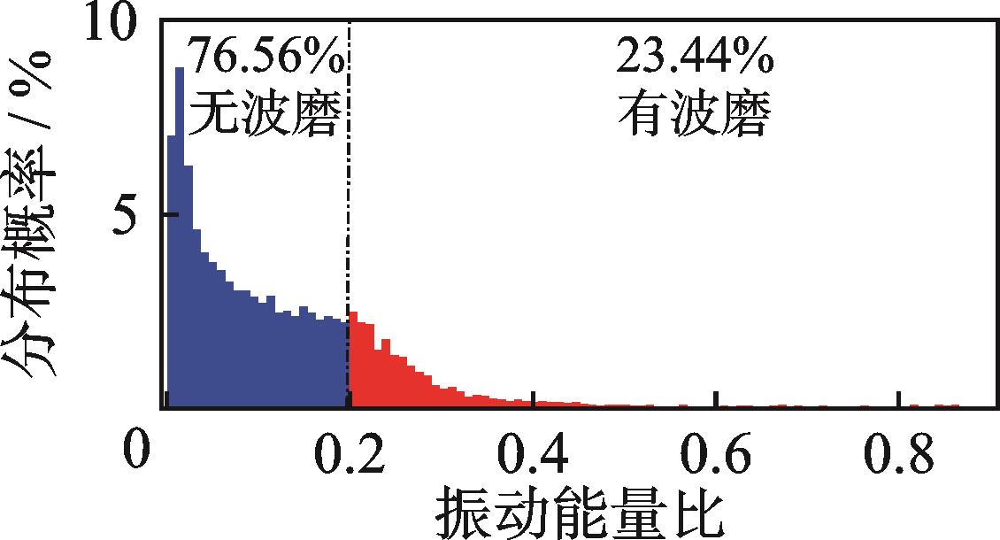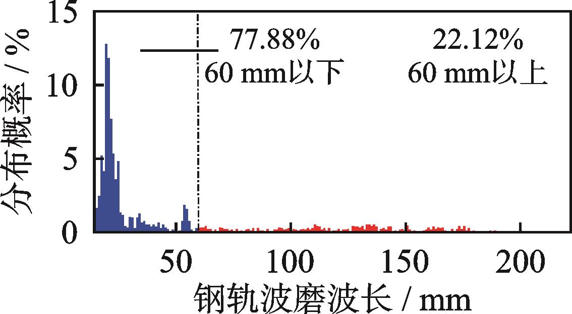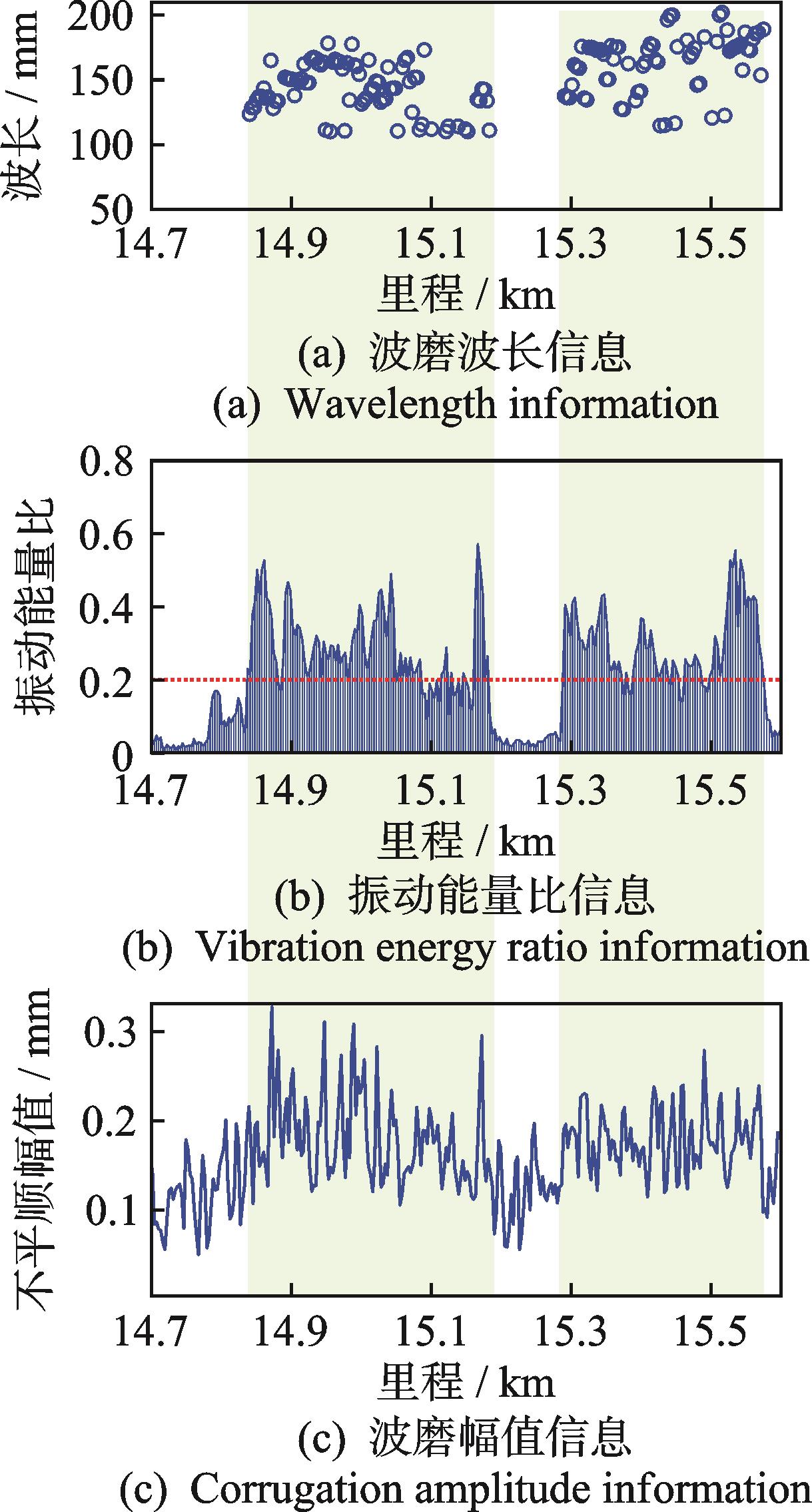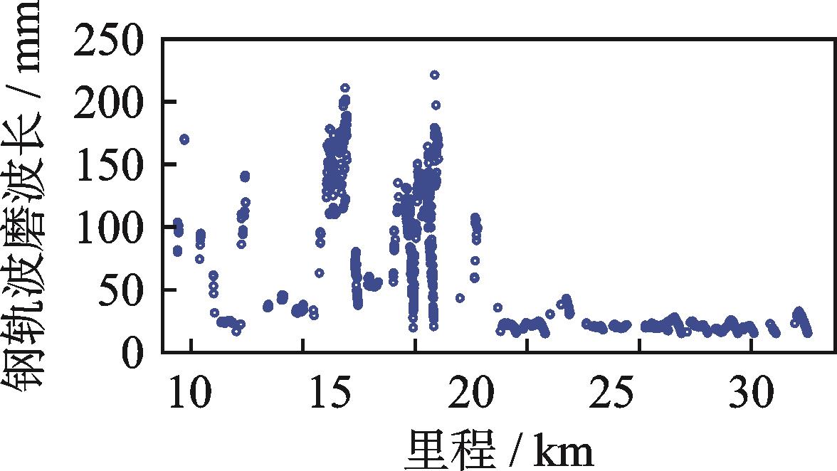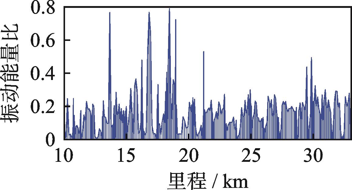 摘要:为研究数据驱动的地铁钢轨波磨状态演变规律,针对地铁钢轨波磨的快速检测问题,提出了一种时空密集型的地铁钢轨波磨快速测量方式。首先,采用高精度传感器检测列车编组车体振动,收集车体三向振动加速度数据;其次,融合不同车体三向振动加速度估计车速和里程位置;然后,采用小波包分解车体垂向振动加速度,定义振动能量比指标,即钢轨波磨波长激发的车体振动特征频带能量与振动总能量的比值,确定振动能量比阈值自动识别钢轨波磨,并输出里程信息;最后,通过车速与特征频率的比值得到钢轨波磨波长信息,并分析振动能量比和钢轨波磨幅值的映射关系。结果表明:振动能量比阈值取为0.2时识别的钢轨波磨里程分布与车厢噪声识别结果一致,计算的钢轨波磨波长与波磨仪实测波长均为175 mm;统计聚类发现钢轨波磨幅值与振动能量比不是单一线性映射关系;基于振动能量比快速检测全线钢轨波磨分布,发现无波磨区段占比为76.56%,波磨区段占比为23.44%,其中钢轨波磨波长以60 mm以下为主,占比为77.88%,波长60 mm以上的波磨占比为22.12%。