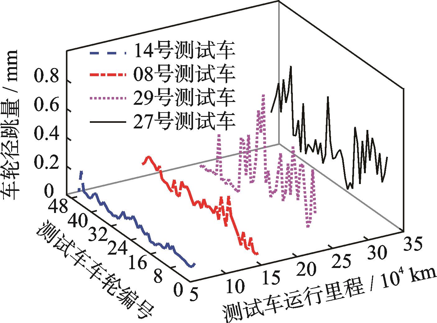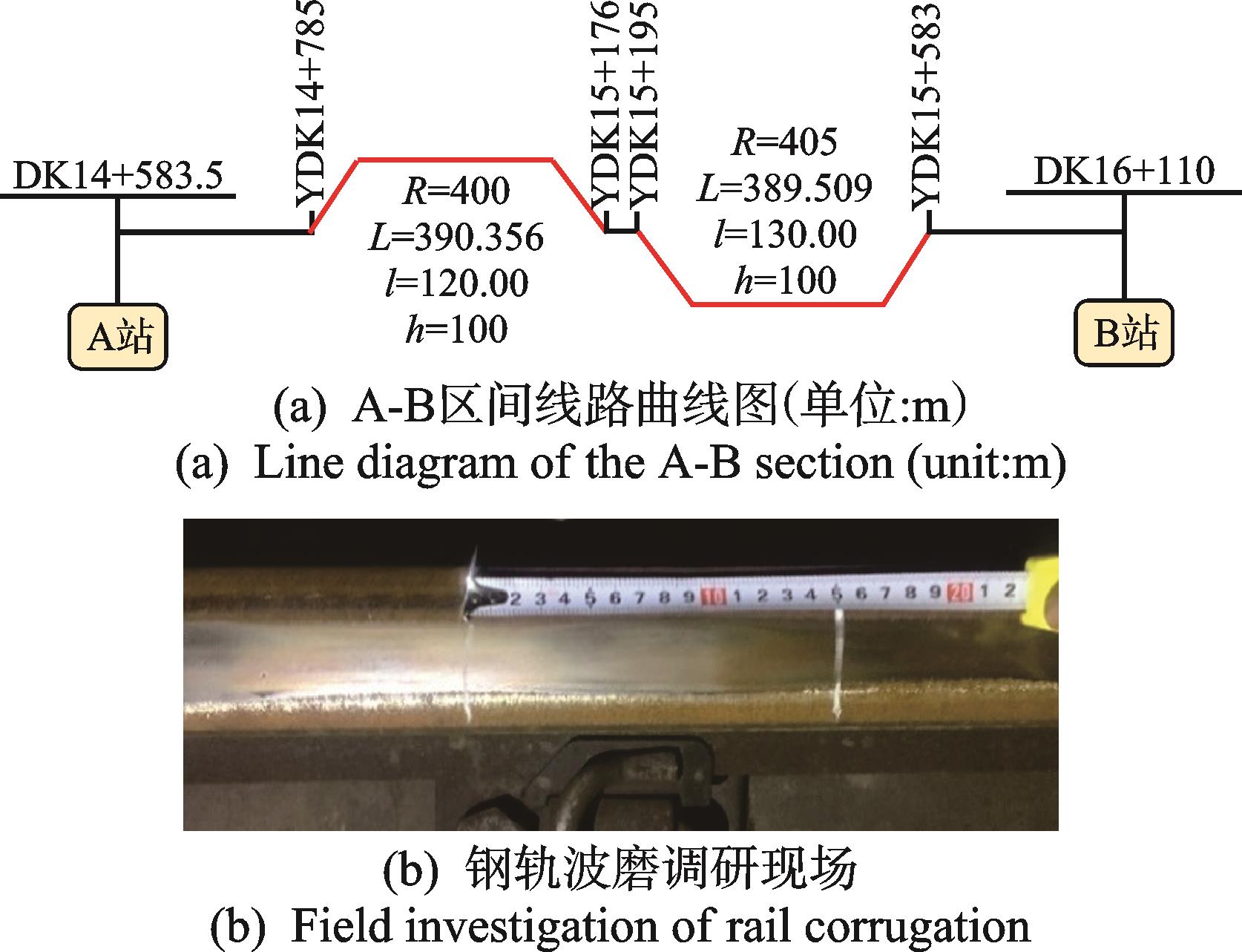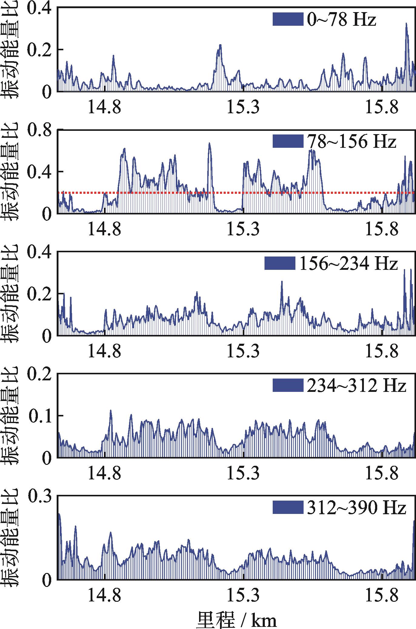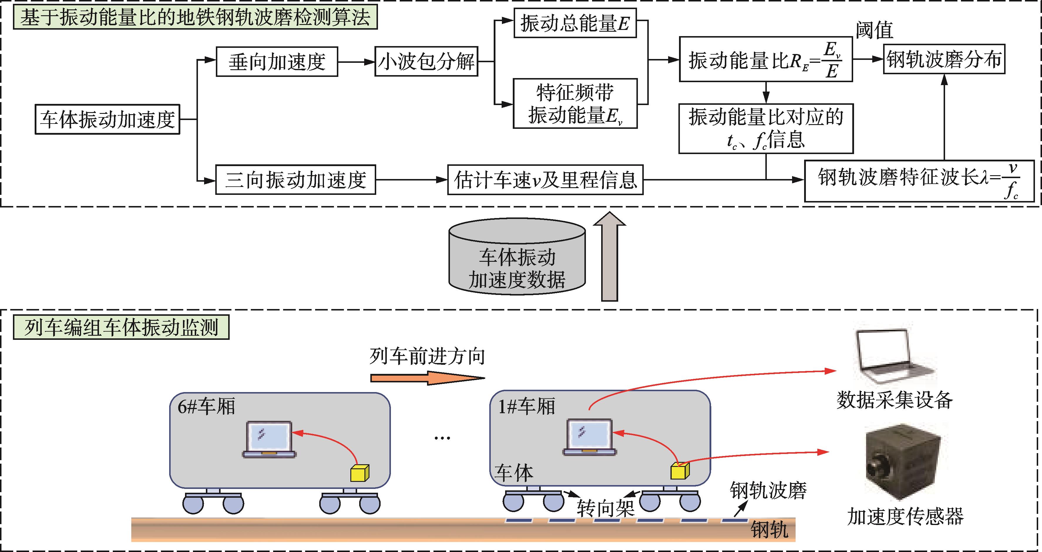 摘要:为研究数据驱动的地铁钢轨波磨状态演变规律,针对地铁钢轨波磨的快速检测问题,提出了一种时空密集型的地铁钢轨波磨快速测量方式。首先,采用高精度传感器检测列车编组车体振动,收集车体三向振动加速度数据;其次,融合不同车体三向振动加速度估计车速和里程位置;然后,采用小波包分解车体垂向振动加速度,定义振动能量比指标,即钢轨波磨波长激发的车体振动特征频带能量与振动总能量的比值,确定振动能量比阈值自动识别钢轨波磨,并输出里程信息;最后,通过车速与特征频率的比值得到钢轨波磨波长信息,并分析振动能量比和钢轨波磨幅值的映射关系。结果表明:振动能量比阈值取为0.2时识别的钢轨波磨里程分布与车厢噪声识别结果一致,计算的钢轨波磨波长与波磨仪实测波长均为175 mm;统计聚类发现钢轨波磨幅值与振动能量比不是单一线性映射关系;基于振动能量比快速检测全线钢轨波磨分布,发现无波磨区段占比为76.56%,波磨区段占比为23.44%,其中钢轨波磨波长以60 mm以下为主,占比为77.88%,波长60 mm以上的波磨占比为22.12%。