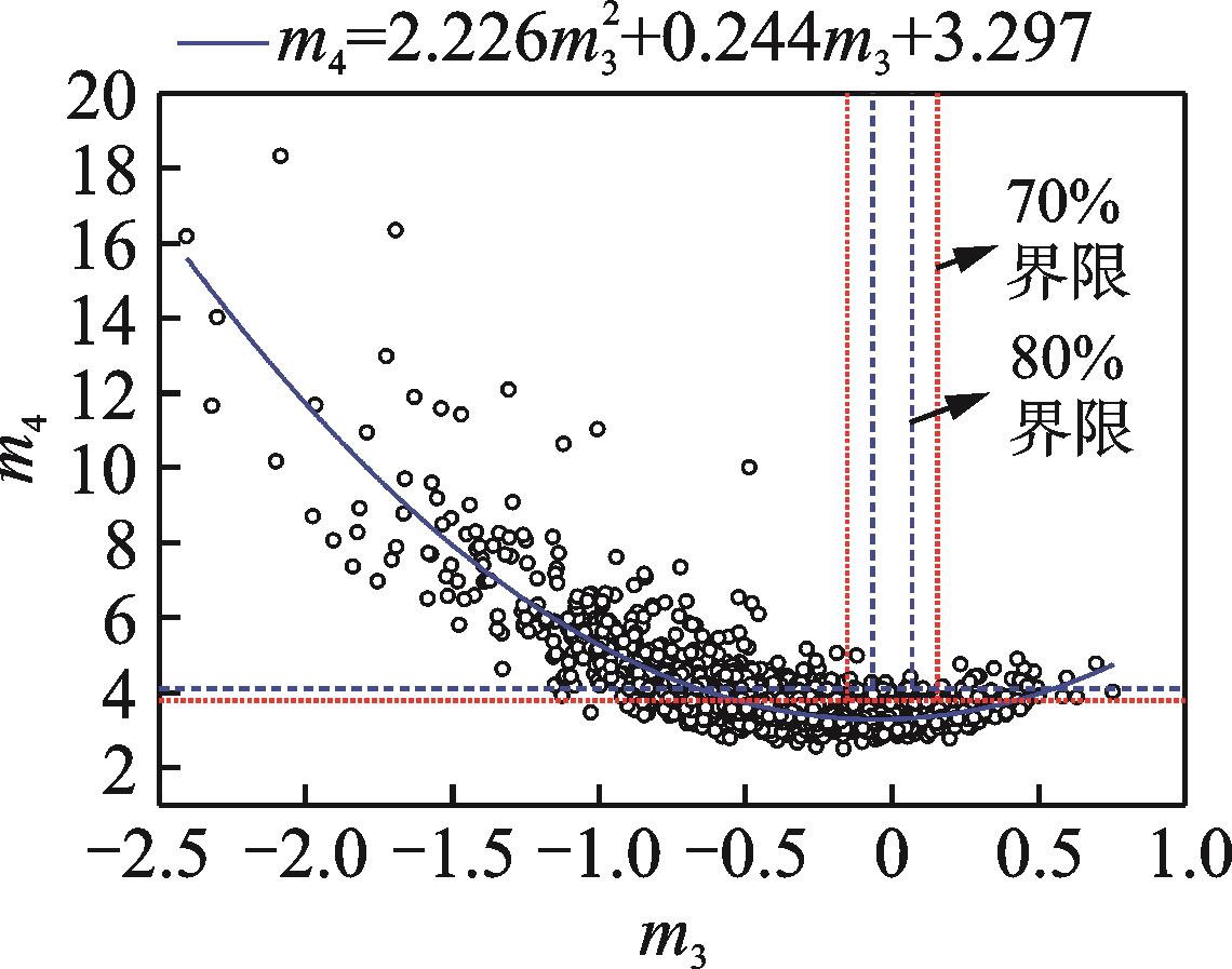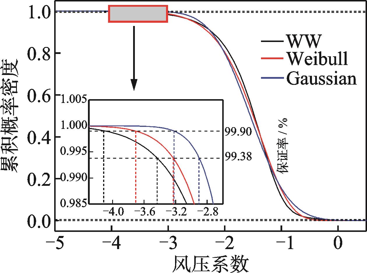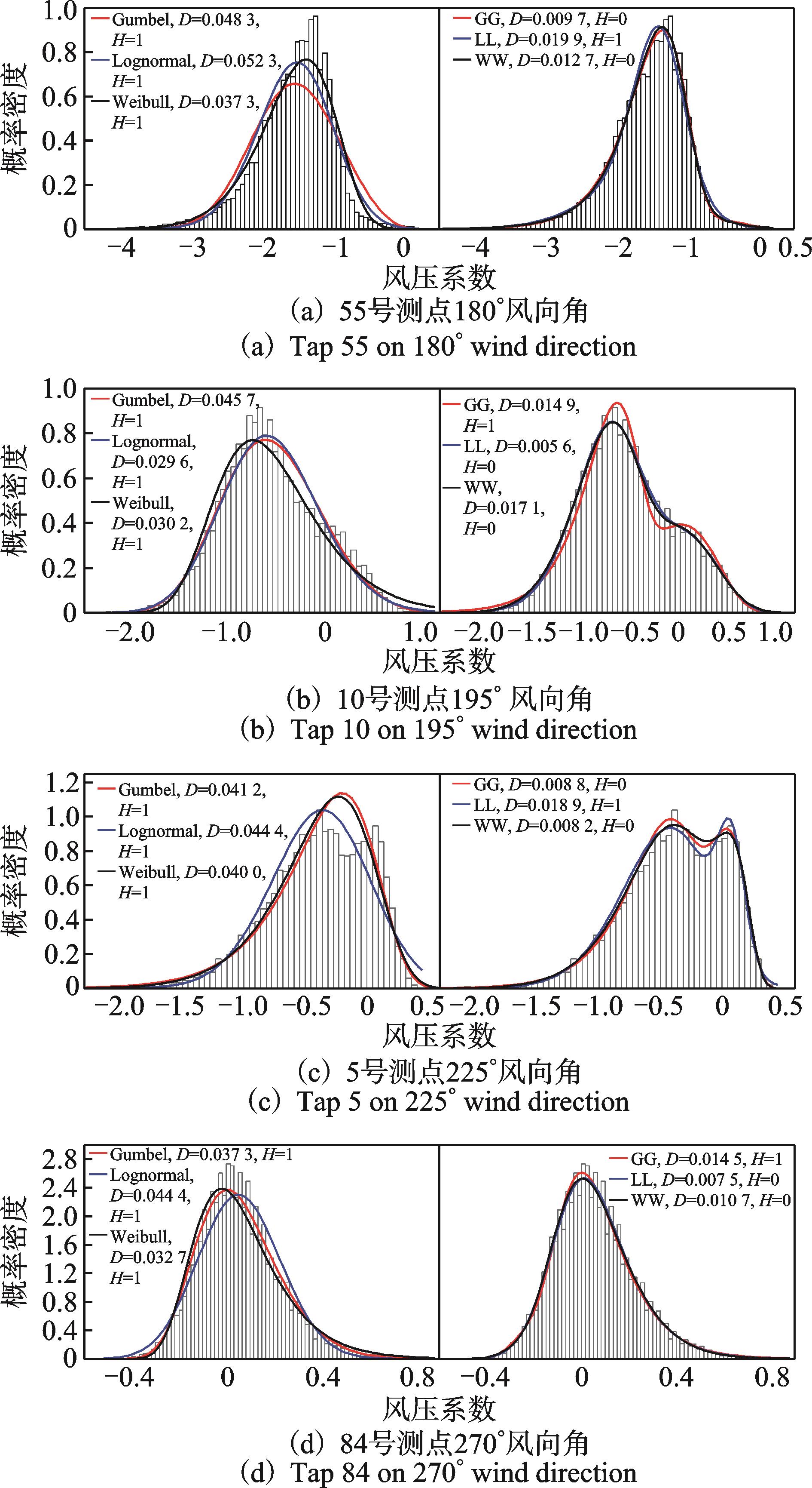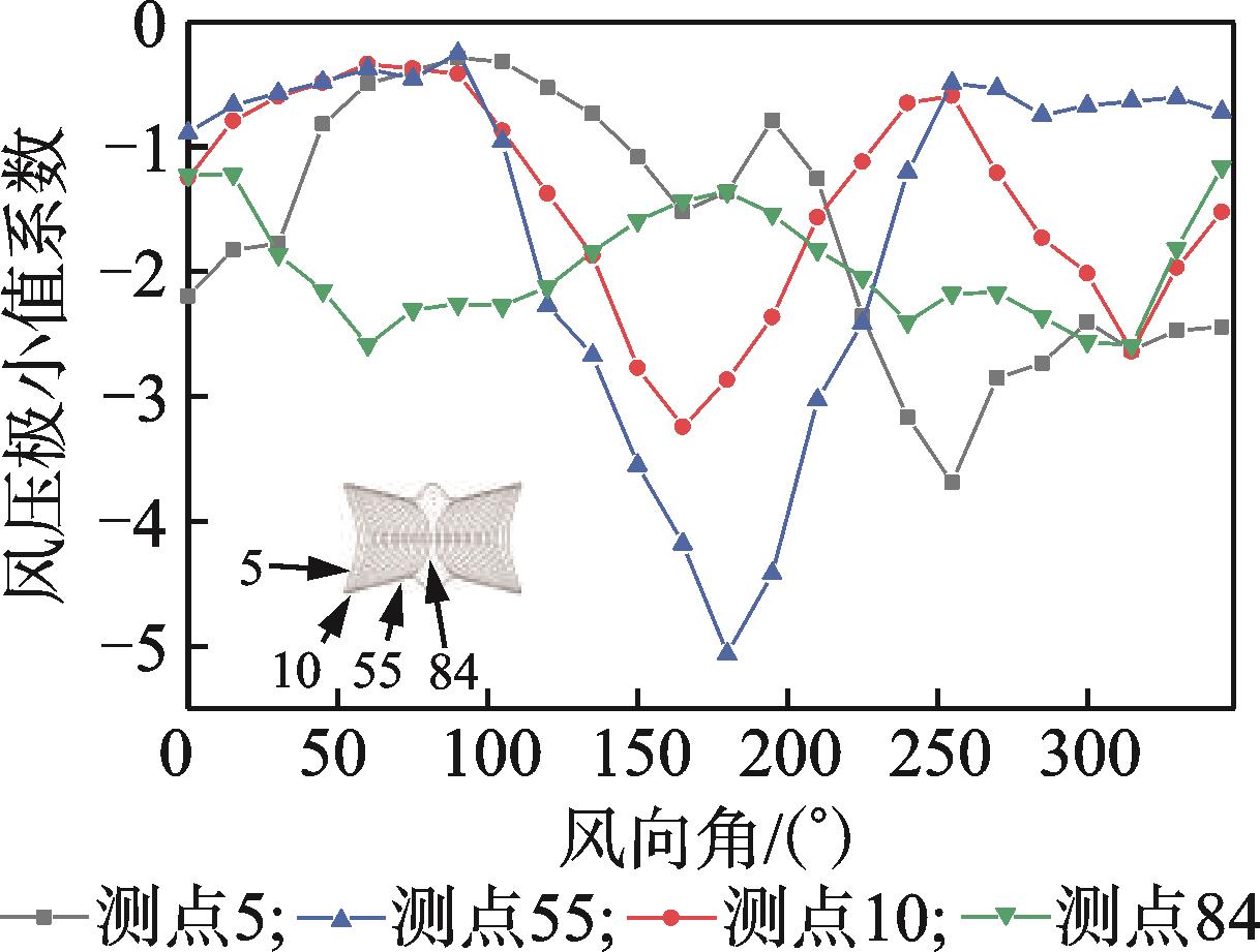 摘要:为了研究大跨屋盖表面风压非高斯特性及极值风压分布,对某高铁站房屋盖进行了风洞测压试验。首先,对表面风压进行高斯分布和非高斯分布的划分;其次,对比3种不同单一概率分布(Gumbel、Lognormal和Weibull)及其对应的组合分布(双Gumbel、双Lognormal和双Weibull)对屋盖表面风压时程的拟合效果,并比较了组合概率分布获取的极值风压与修正Hermite法的估计结果;最后,给出全风向角下屋盖极值风压分布。结果表明:组合概率分布对风压时程的拟合效果优于单一分布,组合分布在同一保证率下的极值估计结果好于单一分布;组合分布在99.90%保证率下的估计效果总体上优于修正Hermite法;极值风压随风向角变化显著,在全风向角下极小值风压系数在屋盖边缘侧中部最小,可达到-5.9。