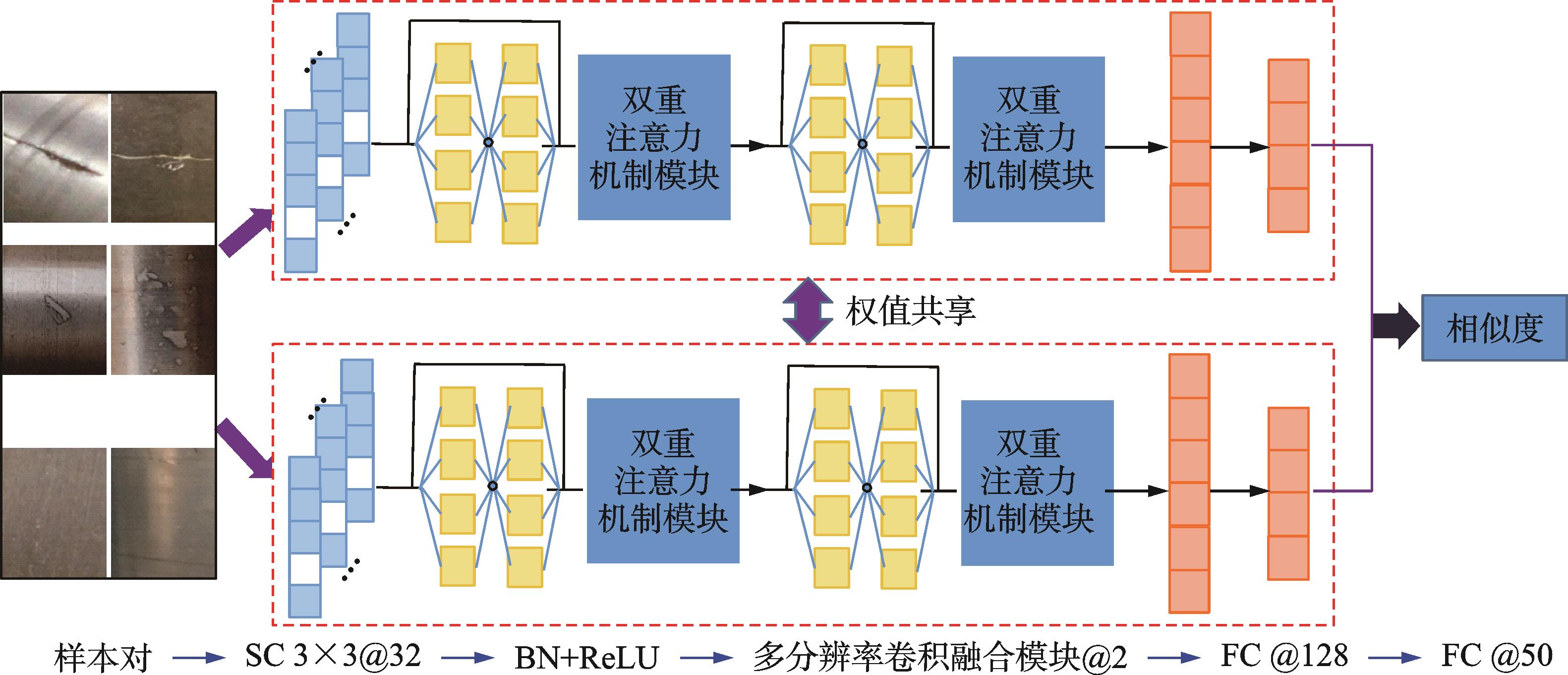 摘要:为了提高小样本图像条件下列车轮对轴承故障检测水平,提出了一种基于多分辨率孪生神经网络(multi-resolution siamese neural network, 简称MrSNN)模型的列车轮对轴承表面缺陷机器视觉检测方法。首先,采用孪生神经网络(siamese neural network, 简称SNN)为基础模型框架,构建了包含不同卷积核尺寸及不同膨胀因子大小的多分辨率卷积融合模块(multi-resolution convolution fusion block, 简称MrCFB)来综合提取图像中的细节特征与轮廓特征信息;其次,采用通道和空间的双重注意力机制重新标定多分辨率特征权重,进一步增强模型的图像特征提取能力;最后,通过对轮对轴承正常、划伤、凹痕及剥落4类图像进行检测分析,完成了算法验证。实验结果表明,轮对轴承3类故障图像识别率为100%,正常图像识别率为95%,总体识别准确率为98.75%,识别准确率优于传统SNN和YOLO-V5等网络模型。