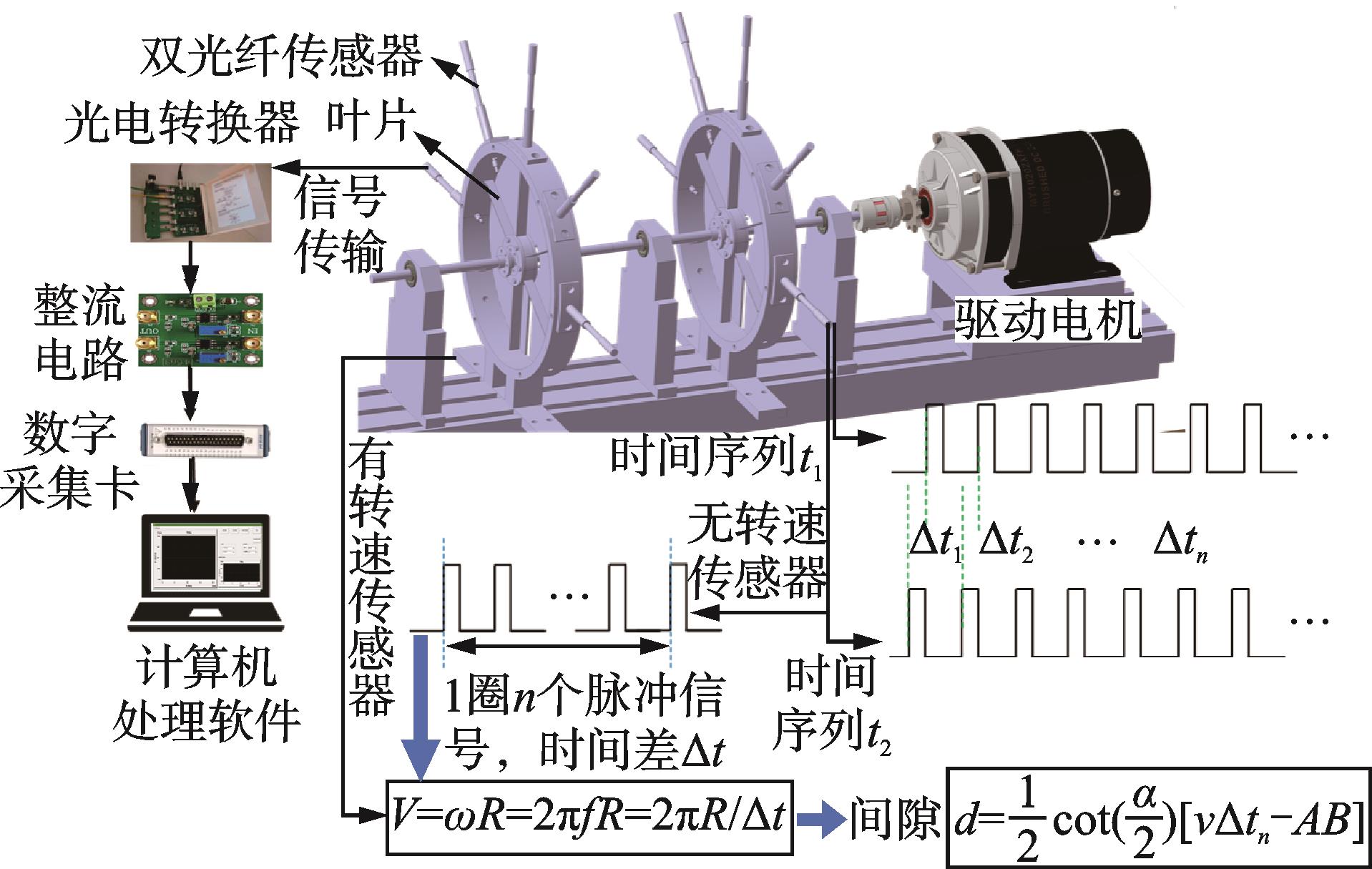 摘要:针对叶尖间隙测量,建立了多截面叶尖间隙测量与验证模拟转子试验台,开发了多通道叶尖间隙在线测量软件。首先,基于激光三角法通过定制的双光纤传感器进行叶尖间隙测量;其次,利用高精度位移平台改变叶尖间隙值,在不同转速下测出精准的叶尖间隙值;最后,针对双光纤传感器测量叶尖间隙的采集卡触发阈值电压问题,设计了多通道一体化电压比较器,消除了双光纤传感器两通道同时测量所带来的10-5 s量级的时间差异。结果表明:该方法基于叶尖定时原理,仅测量叶尖到达时刻即可计算出叶尖间隙;各组间隙平均值误差在5%以内,且各组叶尖间隙测量值的标准差均小于22 μm,证明了叶尖间隙测量系统的准确性与可重复性。