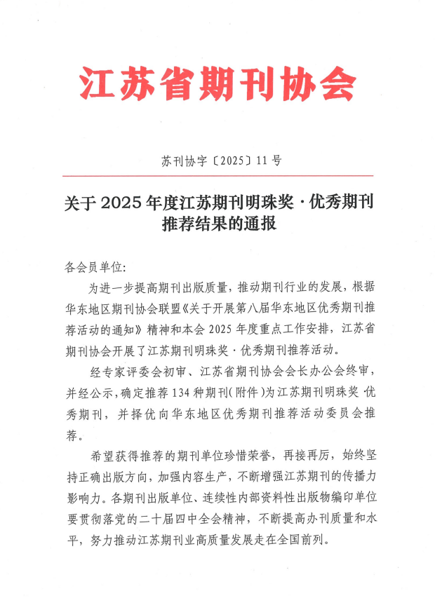 为进一步提高期刊出版质量,推动期刊行业的发展,根据华东地区期刊协会联盟《关于开展第八届华东地区优秀期刊推荐活动的通知》精神,江苏省期刊协会开展了本次优秀期刊推荐活动。经专家评委会初审、江苏省期刊协会会长办公会终审,并经公示,确定推荐134种期刊为江苏期刊明珠奖·优秀期刊,并择优向华东地区优秀期刊推荐活动委员会推荐。