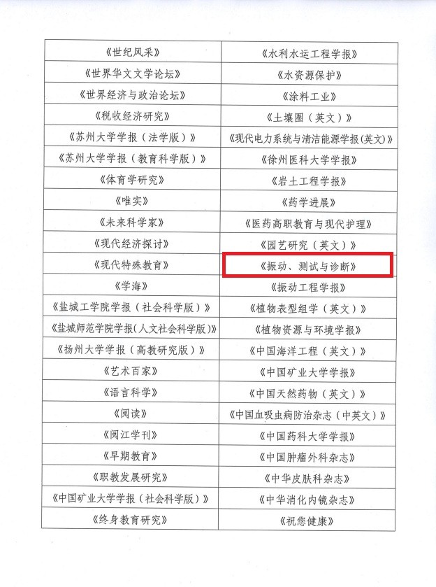 近日,江苏省期刊协会正式公布“江苏期刊明珠奖·优秀期刊”推荐名单,《振动、测试与诊断》成功入选。