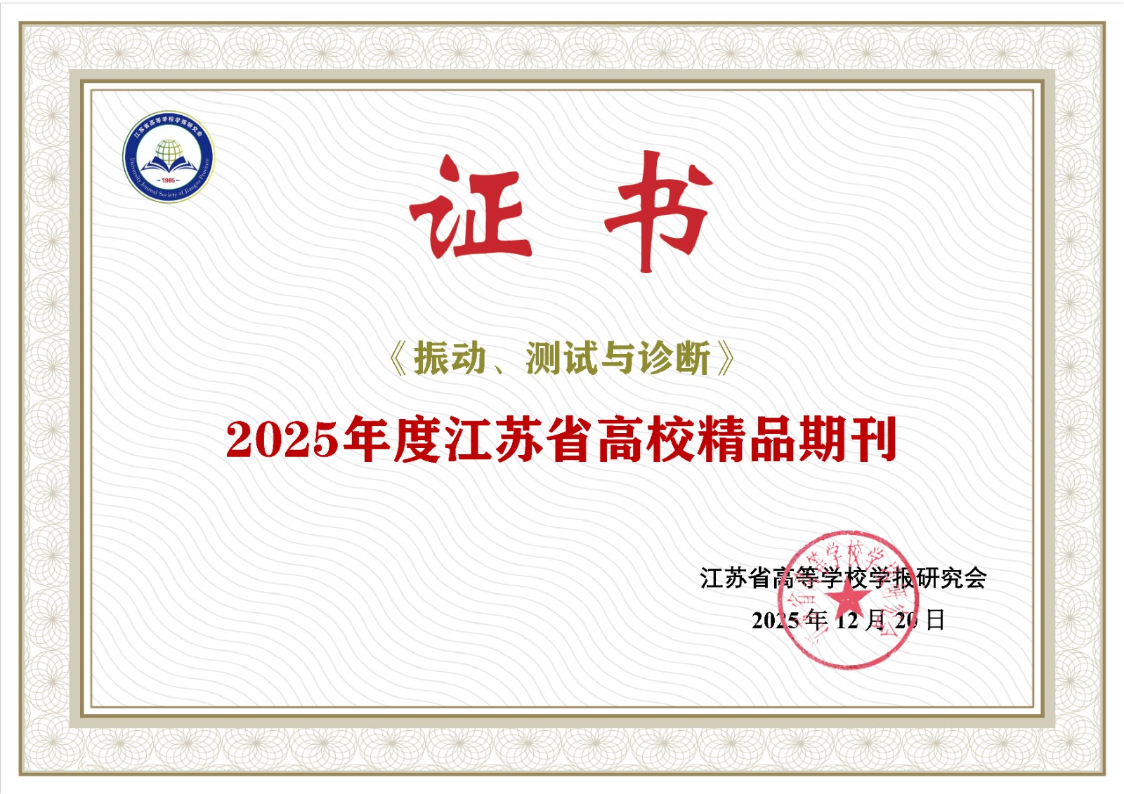 近日,江苏省高等学校学报研究会公布了“2025年度江苏省高校精品·优秀·特色科技期刊”遴选结果,《振动、测试与诊断》期刊荣获“特色期刊”称号,这是对我刊长期坚持高质量发展、突出学科特色、服务科技创新的充分肯定。